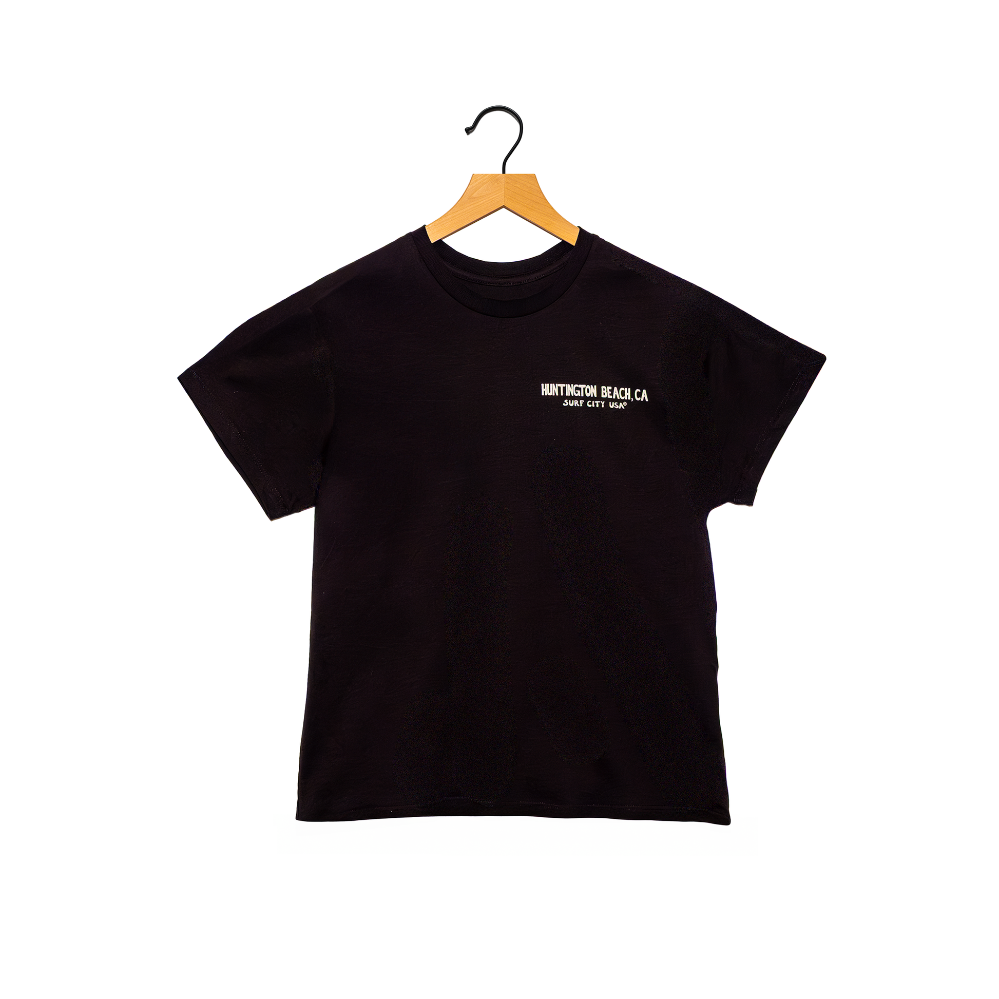 Catch a vibe and the waves in the HB Surf Zone Map t-shirt, which features the ultimate local surfer's map of the HB coast on the back. Women's boyfriend cut cotton premium tee in Black. Sizes XS-XL.